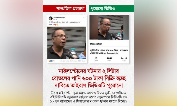 অনুসন্ধান টিম ফ্যাক্টচেক করে জানায়, ‘২ লিটার পানির বোতল ৬০০ টাকায় বিক্রি হচ্ছে’ এমন দাবিতে ভাইরাল হওয়া ভিডিওটি পুরোনো ও ভিন্ন ঘটনার সঙ্গে সম্পৃক্ত।