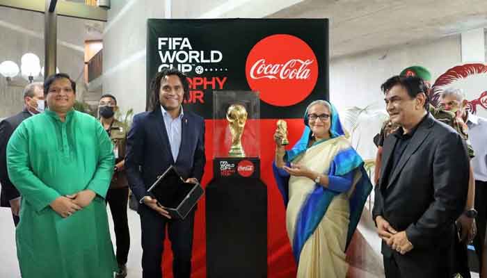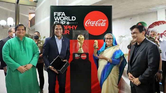 কাতারে অনুষ্ঠিত ২০২২ বিশ্বকাপ উপলক্ষে ফিফা বিশ্বকাপ ট্রফির বিশ্বভ্রমণের অংশ হিসেবে বুধবার (৮ জুন) সন্ধ্যায় গণভবনে প্রধানমন্ত্রী শেখ হাসিনাকে বিশ্বকাপের সোনালি শিরোপ প্রদর্শন করা হয়।